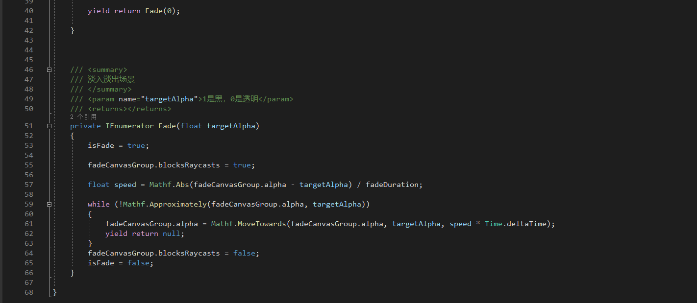 他这个是用携程来触发 首先写好了我们的一个淡入淡出效果 做了一个Bool来判断当前是否处于切换0-1的状态中