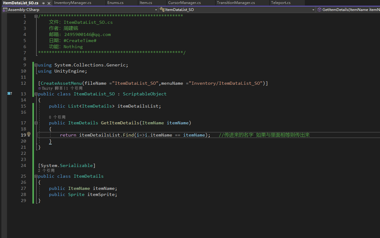 ItemDataList_SO这个就是创建的参数 写的list来选择数量加减 然后下面的ItemDetails 则是写具体参数 并且需要序列化