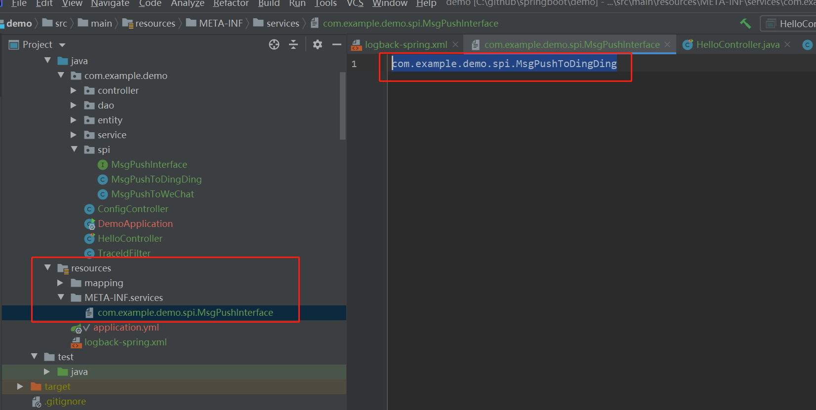 输出结果显示是调钉钉的,如果meta-inf文件下里写的是发到微信的接口,就会调微信的实现