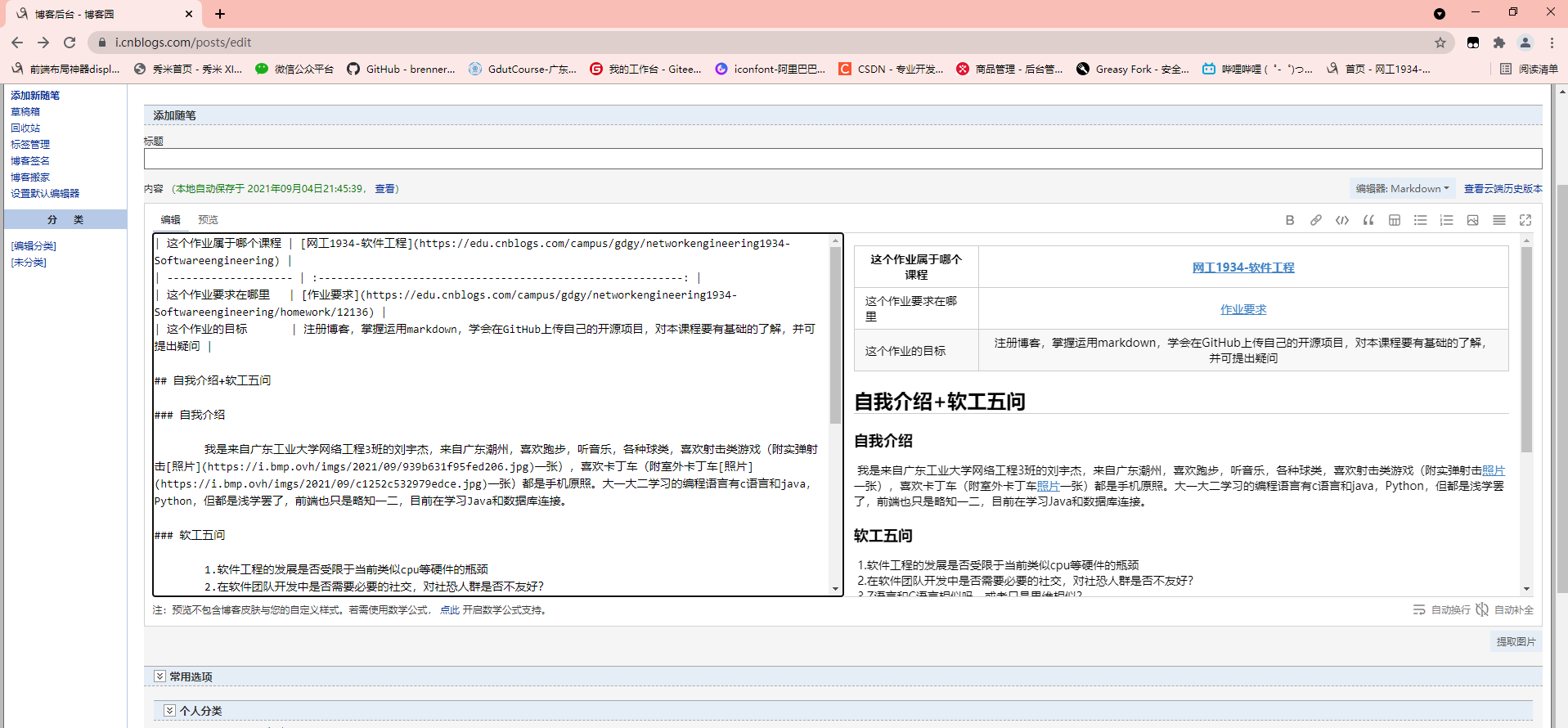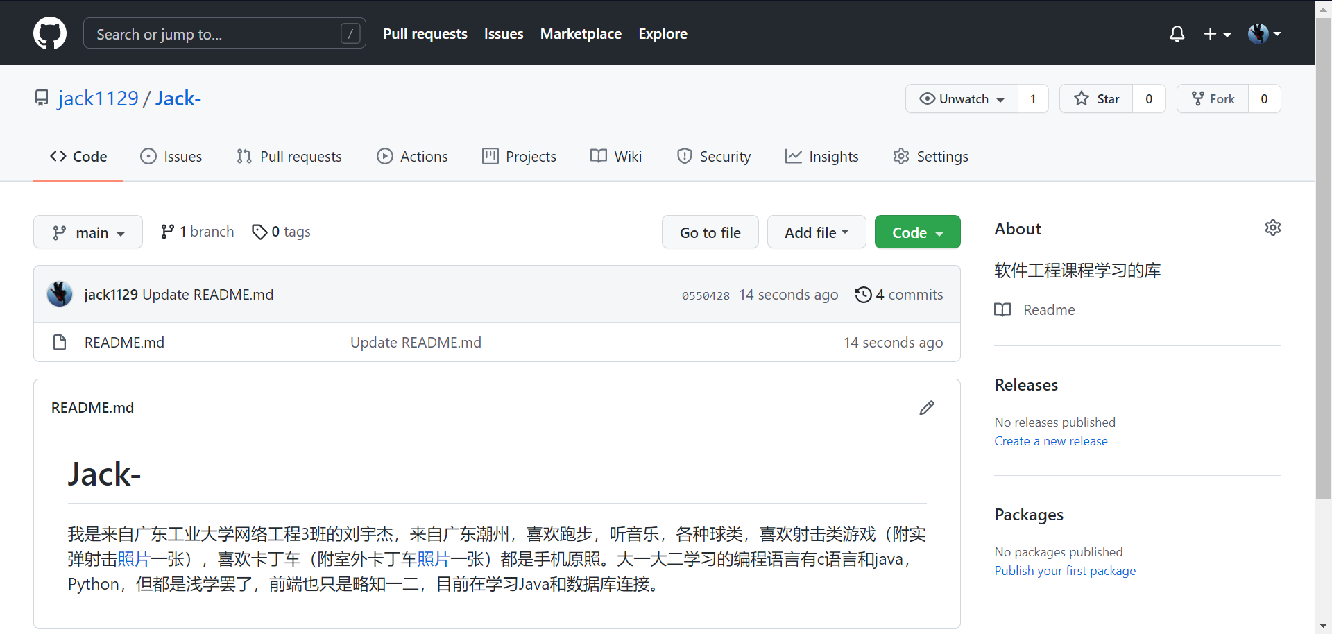 | 这个作业的目标 | 注册博客,掌握运用markdown,学会在GitHub上传自己的开源项目,对本课程要有基础的了解,并可提出疑问 |