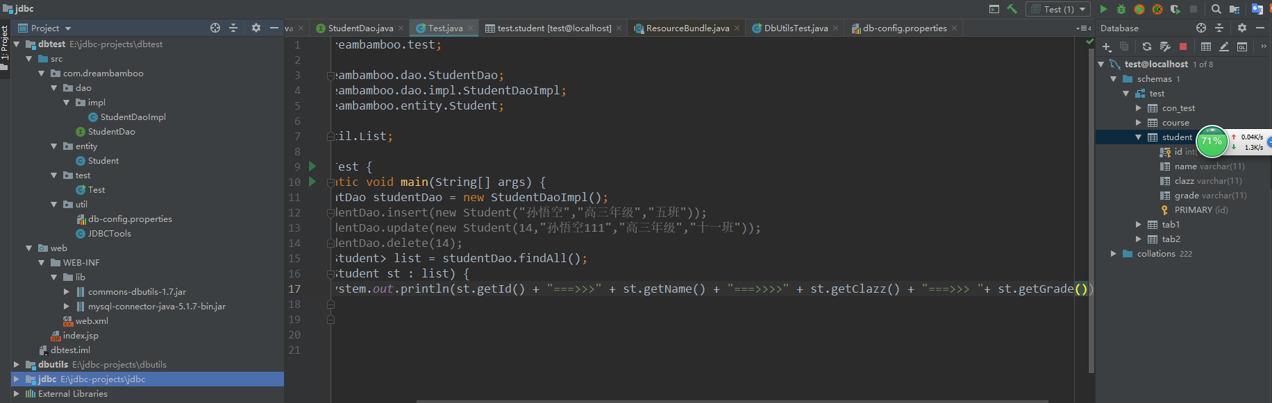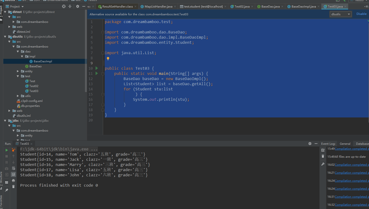 package com.dreambamboo.test; import com.dreambamboo.dao.BaseDao; import com.dreambamboo.dao.impl.BaseDaoImpl; import com.dreambamboo.entity.Student; import java.util.List; public class Test03 { public static void main(String[] args) { BaseDao baseDao = new BaseDaoImpl(); List<Student> list = baseDao.getAll(); for (Student stu:list ) { System.out.println(stu); } } }