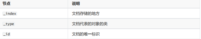 一个文档不只有数据。它还包含了元数据(metadata)——关于文档的信息。三个必须的元数据节点是: