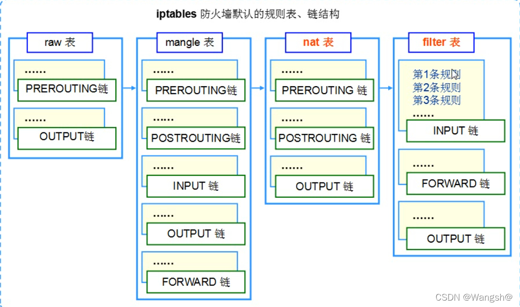 具有某一相似用途的防火墙规则,按照不同处理时机区分到不同的规则链以后,被归置到不同的表中