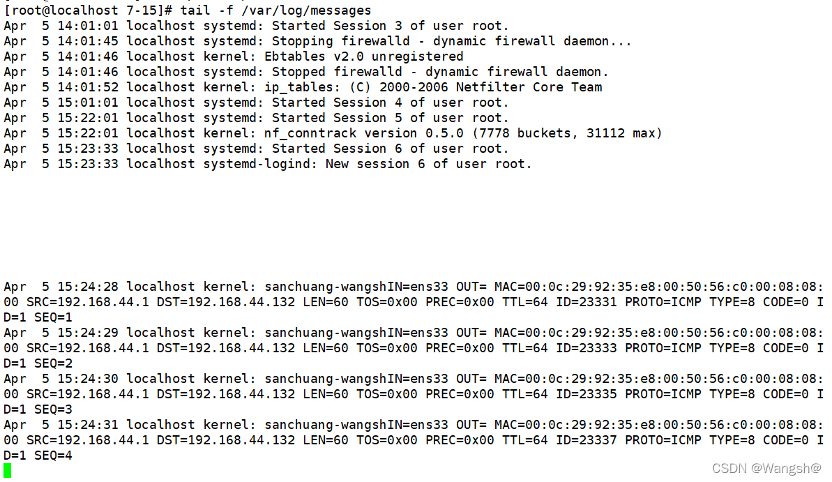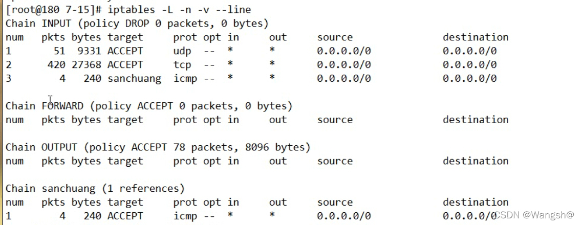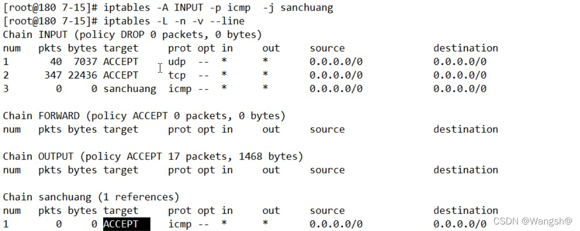 LOG icmp -- anywhere anywhere icmp echo-request LOG level warning prefix sanchuang-wangsh