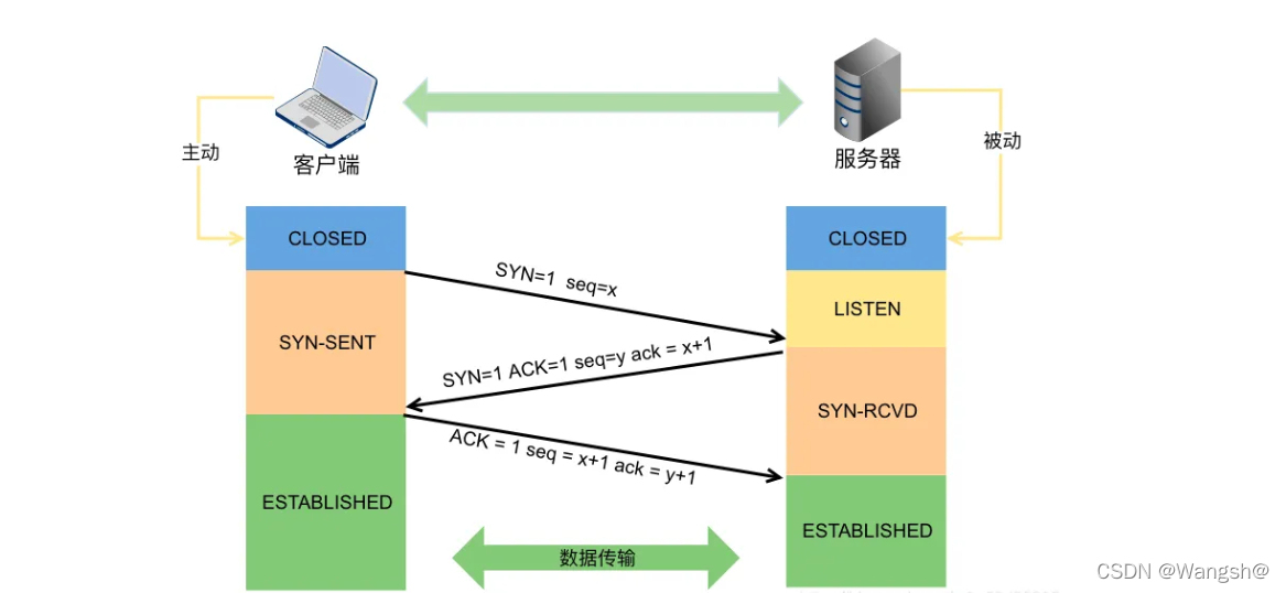 客户机A收到B的确认以后,还要给B给出确认,确认报文ACK=1,确认号ack=y+1,自己的序号seq=x+1,这时TCP连接已经建立,A进入ESTABLISHED(已建立连接)状态,当B收到A的确认以后,也进入ESTABLISHED状态。