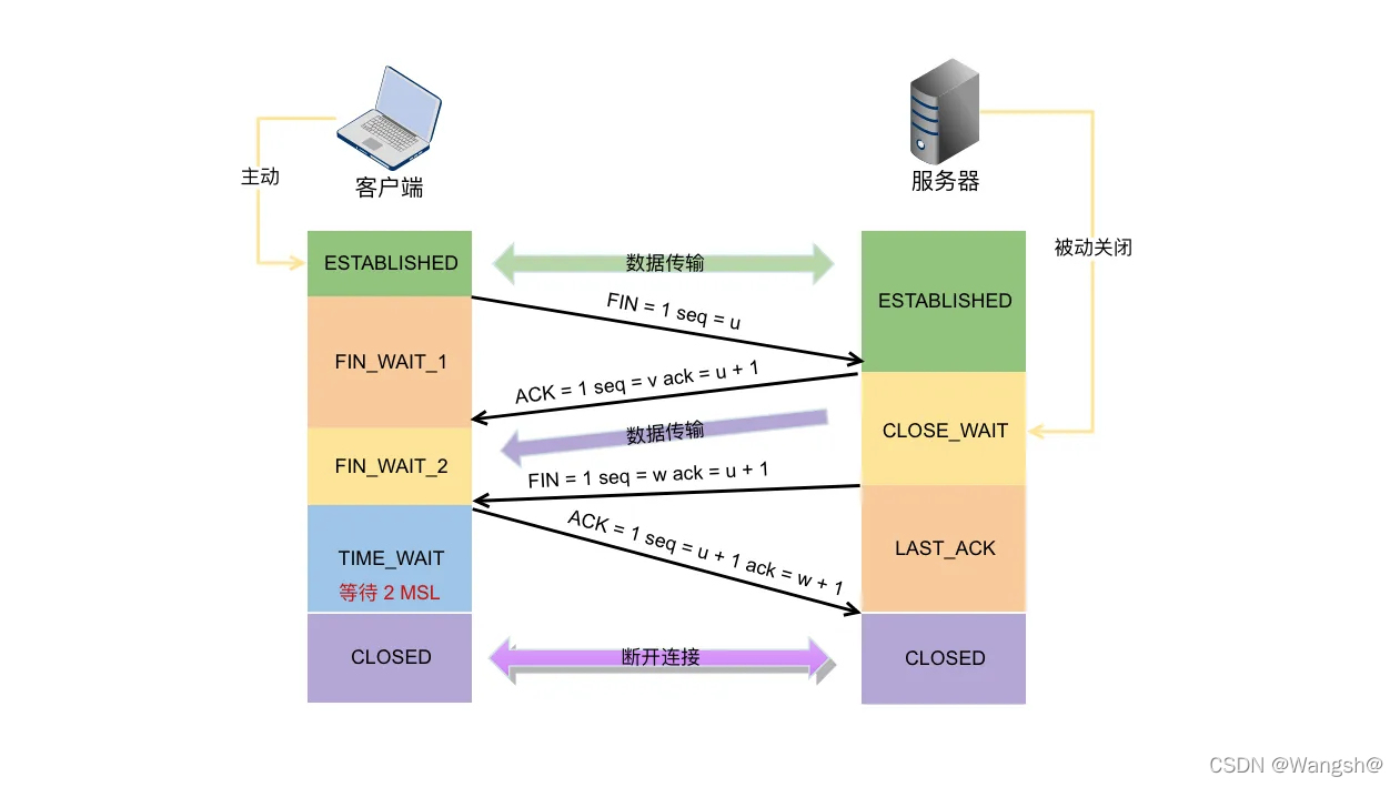 1.客户机A发送连接释放报文,并且停止发送数据,主动关闭TCP连接,A把连接释放报文段首部的终止控制位FIN=1其序号seq=u(等于前面已经传送过的数据的最后一个字节的序号加1),这时候A进入FIN-WAIT-1(终止等待1)状态,等待B的确认,注意,TCP规定,FIN报文段即时不携带数据,他也会消耗掉一个序号。