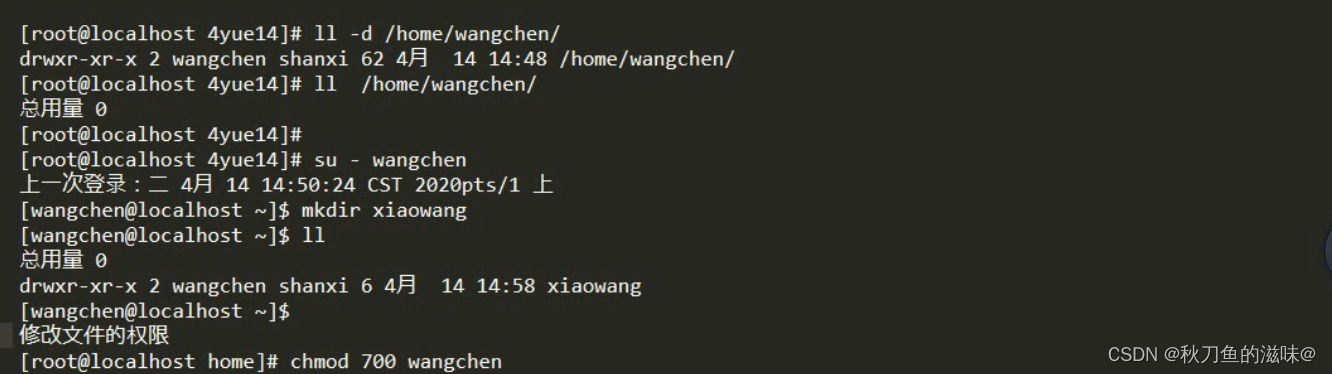 然后还要修改权限,让其他用户无法访问wangchen的家目录