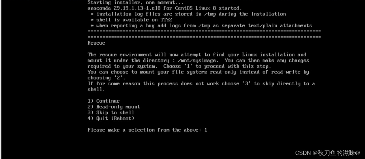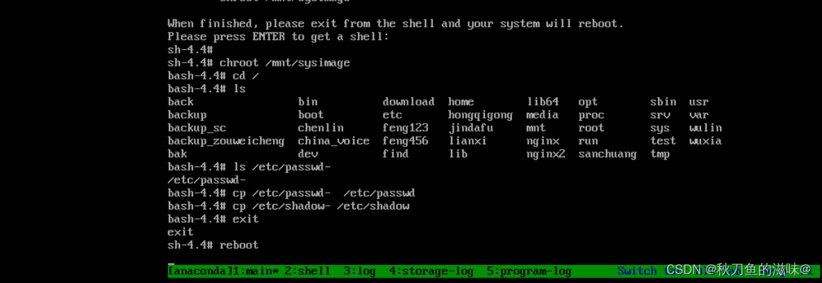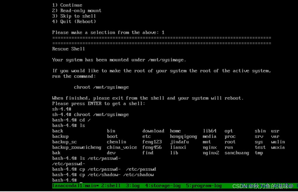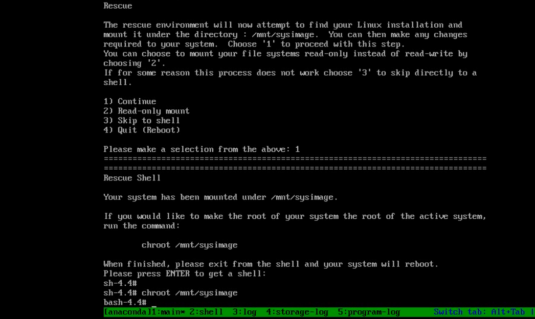 输入 chroot /mnt/sysimage 让光盘里面的系统按照原来硬盘里面的文件系统去挂载分区,加载原来系统里面的内容