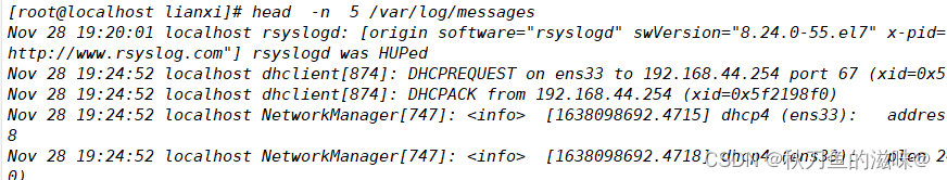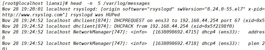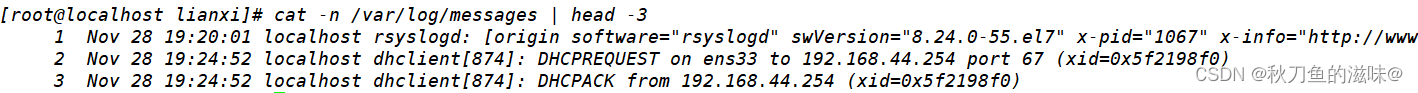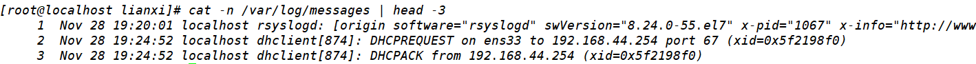 (cat 命令和管道符号连用查看 messages 文件的前三行)