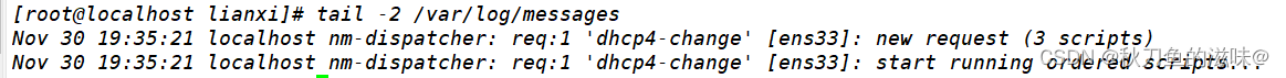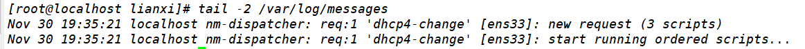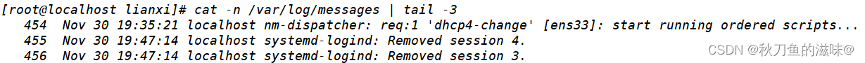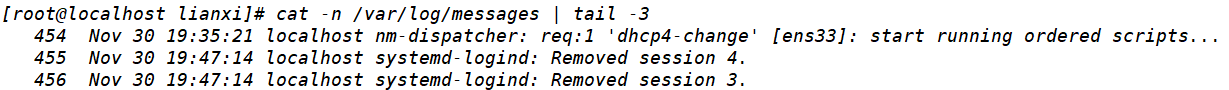 (cat 命令和管道符号连用查看 messages 文件的后三行)
