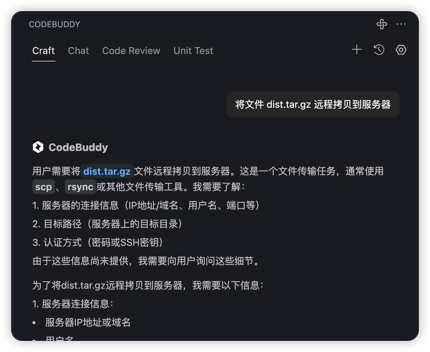 没关系,我们把服务器的信息都发给 CodeBuddy 就行,即使是密钥文件,我们告诉它密钥文件路径就行,它就会自己去本地磁盘去找。然后它就会执行上传操作了,如下图所示,dist.gz.tar 文件上传成功了