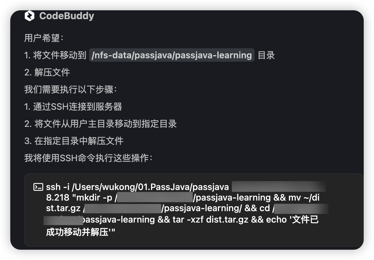 这个手动打包部署到动作虽然简单,但这种重复性工作我是非常不喜欢的。突发奇想,可否让 CodeBuddy 帮我执行编译->打包->上传->部署的命令呢?