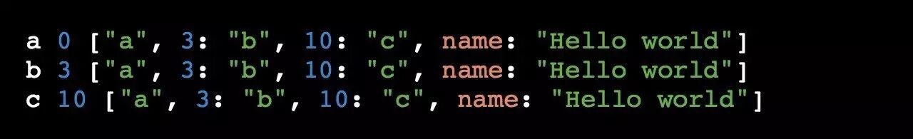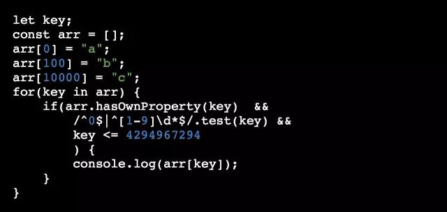 for-in 只会遍历存在的实体,上面的例子中, for-in 遍历了3次(遍历属性分别为"0"、 "100"、 "10000"的元素,普通 for 循环则会遍历 10001 次)。所以,只要处理得当, for-in 在遍历 Array 中元素也能发挥巨大作用。