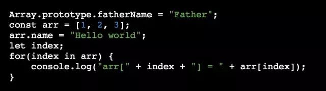 我们看到 for-in 循环访问了我们新增的 "name" 属性,因为 for-in 遍历了对象的所有属性,而不仅仅是“索引”。同时需要注意的是,此处输出的索引值,即 "0"、 "1"、 "2"不是 Number 类型的,而是 String 类型的,因为其就是作为属性输出,而不是索引。那是不是说不在我们的 Array 对象中添加新的属性,我们就可以只输出数组中的内容了呢?答案是否定的。因为 for-in 不仅仅遍历 array 自身的属性,其还遍历 array 原型链上的所有可枚举的属性。下面我们看个例子: