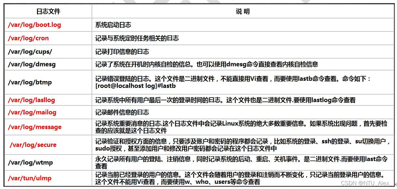 日志文件是重要的系统信息文件,其中记录了许多重要的系统事件,包括用户的登录信息、系统的启动信息、系统的安全信息、邮件相关信息、各种服务相关信息等。