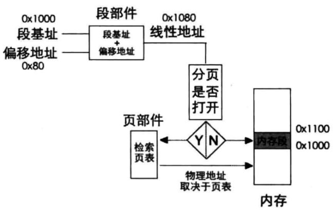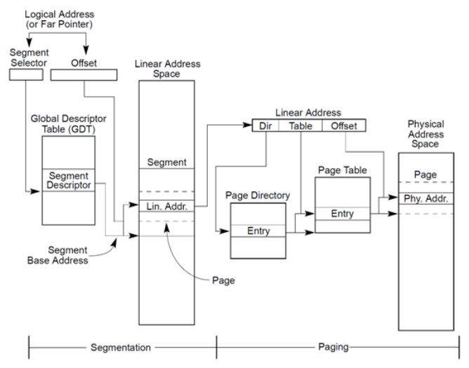 分页机制是工作在分段机制下的,在保护模式下,通过选择子找到段基址,通过段基址:段内偏移的方式组合成线性地址,拿到线性地址之后会根据是否开启分页来找到实际的物理地址,用一副图来解释更加