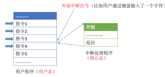 外中断:外中断的信号来源于CPU外部、与当前执行的指令无关。如用户强制结束一个进程、IO设备完成操作发生的中断信号。