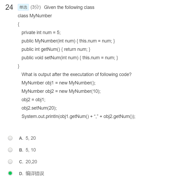 MyNumber类定义了带参的构造函数,编译器就不会再自动加上空的不带参构造函数,所以代码 MyNumber obj1 = new MyNumber();会出现编译错误