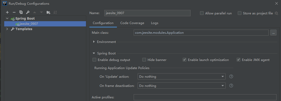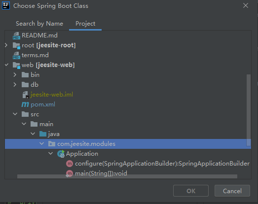 5. 配置spring boot,Main class选择jeesite/web/src/main/java/com.jeesite.modules/Application