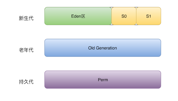 Hotspot VM将内存划分为不同的物理区,就是“分代”思想的体现。如图所示,JVM内存主要由新生代、老年代、永久代构成。