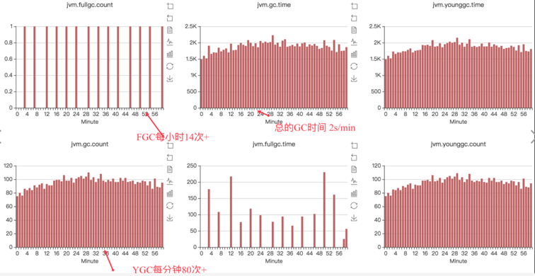 由此可见,服务中存在大量短期临时对象,扩容新生代空间后,Minor GC频率降低,对象在新生代得到充分回收,只有生命周期长的对象才进入老年代。这样老年代增速变慢,Major GC频率自然也会降低。