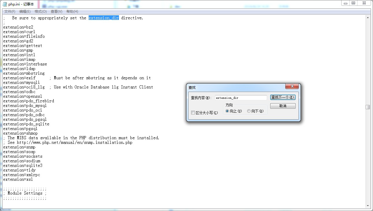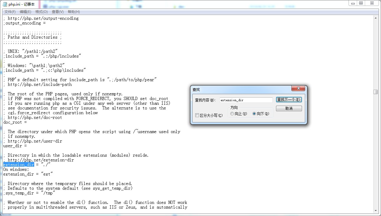 扩展文件夹位置打开了接下来打开扩展,接着继续搜索extension_dir 找到第三个extension_dir的位置,如图蓝色背景为找到的: