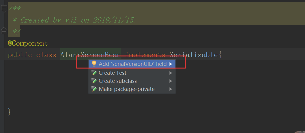 2、在实现了 Serializable的bean类下, 鼠标移到bean类名处,按住 alt+enter,就会自动弹出【Add serialVersionUID field】