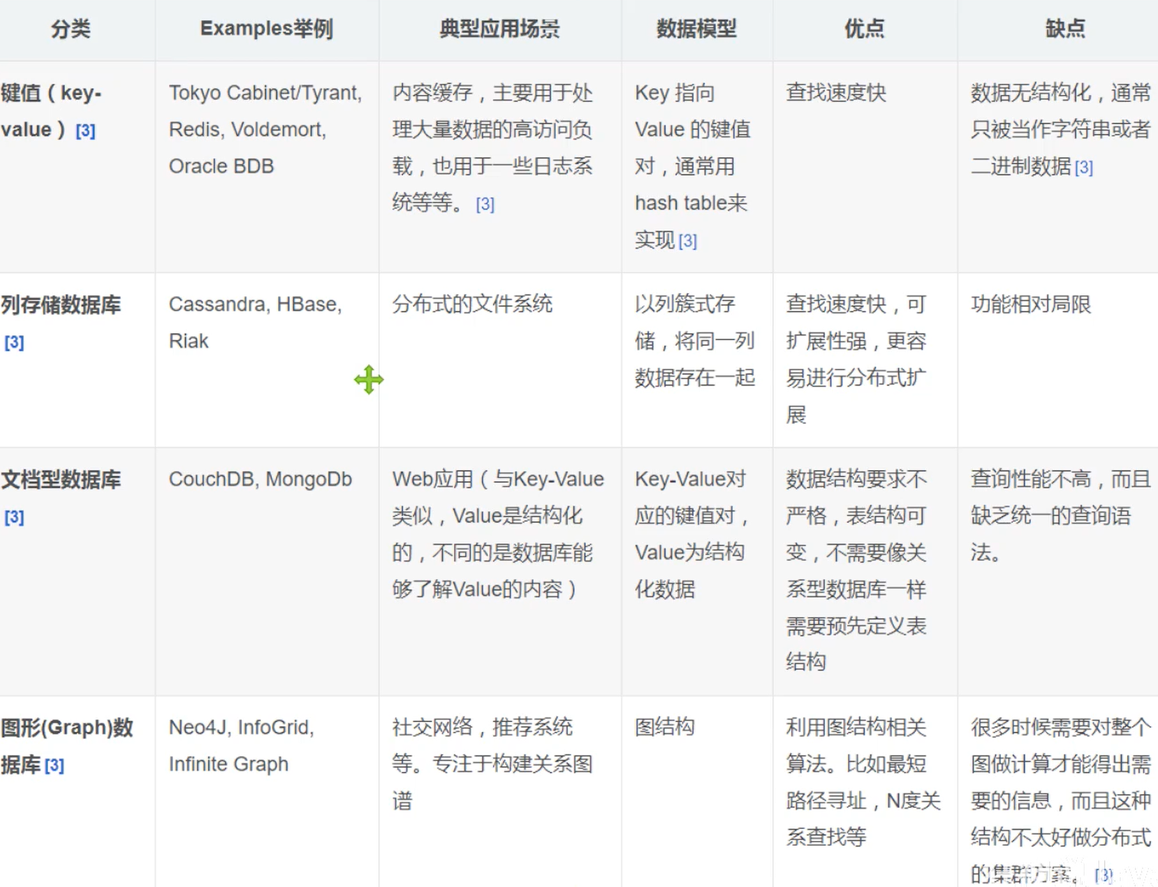 - 键值对存储 列存储 文档存储 图像数据库(社交关系)