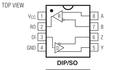 pin2:RO,接收器输出。若A-B>0.2V,RO为高电平,A-B<0.2V,RO为低电平。
