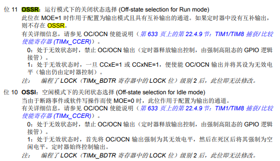 Break and dead time management (BRK): //需要设置tim bkin引脚。将此引脚连至电压电流(对三相桥过压、过流保护)