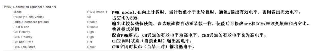 channel1:选择通道模式,有输出比较模式、pwm模式、输入捕获模式等等。这里选:PWM generation CH1 CH1N。一个通道发出两路互补的PWM。