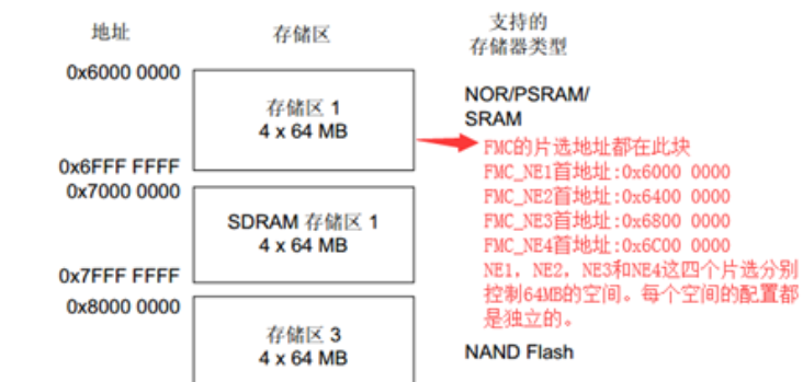 我fpga中使用8bit作为地址总线。FMC_NE1:首地址0x6000 0000,可以管理的地址范围0x6000 0000到0x63FF FFFF,64MB。
