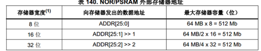 如配置外部存储器的宽度为16位, FMC将使用内部的ADDR[25:1]地址来作为对外部存储器的寻址地址FMC_A[24:0]。如果存储器宽度为32位, FMC将使用内部的ADDR[25:2]地址进行外部寻址。