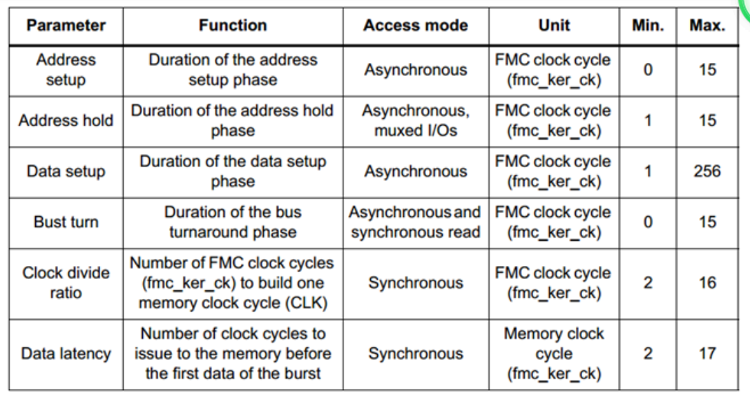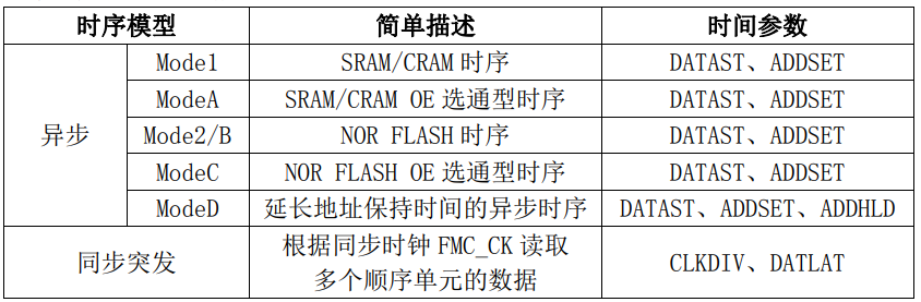 在实际扩展时,根据选用存储器的特征确定时序模型,从而确定各时间参数与存储器读/ 写周期参数指标之间的计算关系;利用该计算关系和存储芯片数据手册中给定的参数指标,可 计算出 FMC 所需要的各时间参数,从而对时间参数寄存器进行合理的配置。