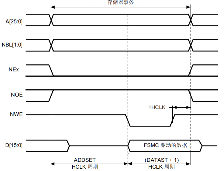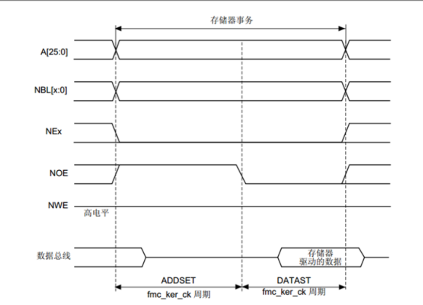 NEx片选后,NOE要保持一段时间的高电平,这个时间就是ADDSET地址建立时间(通过寄存器FMC_BTRx可配置)。之后NOE变为低电平,读使能。低电平保持的时间由DATAST数据建立时间(通过寄存器FMC_BTRx可配置)决定。