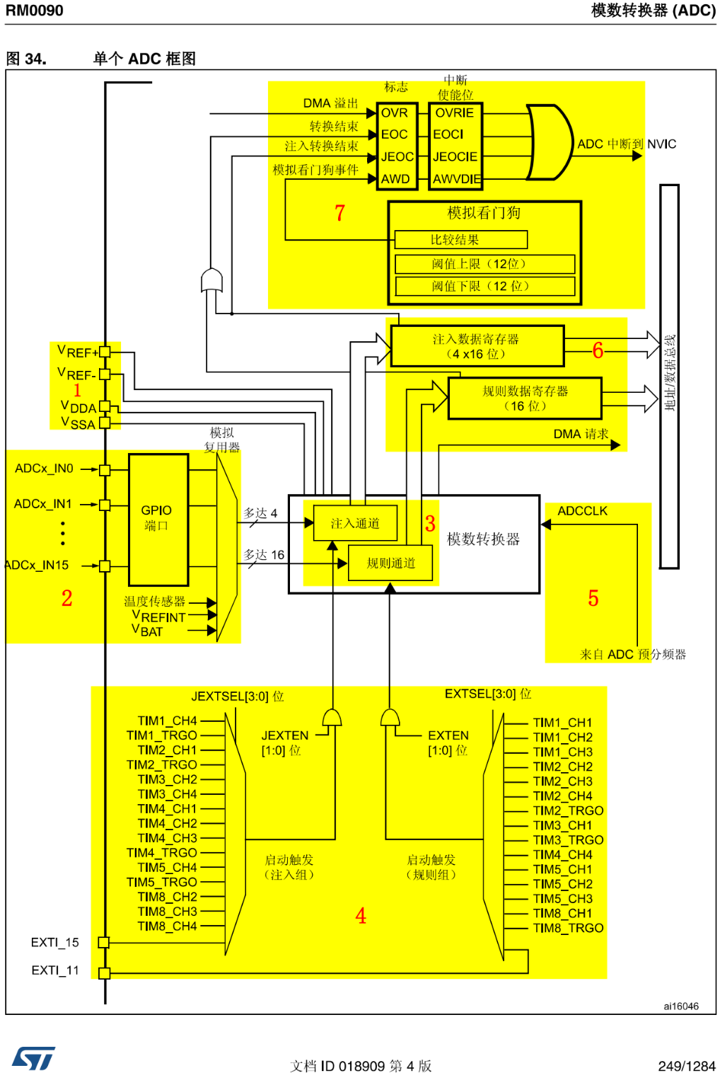 框图说明: ①处:电源相关,是 ADC 的供电电源()和参考电源()。为了提高转换的精确度,ADC使用一个独立的电源供电,过滤和屏蔽来自印刷电路板上的毛刺干扰;ADC的电源引脚为VDDA,