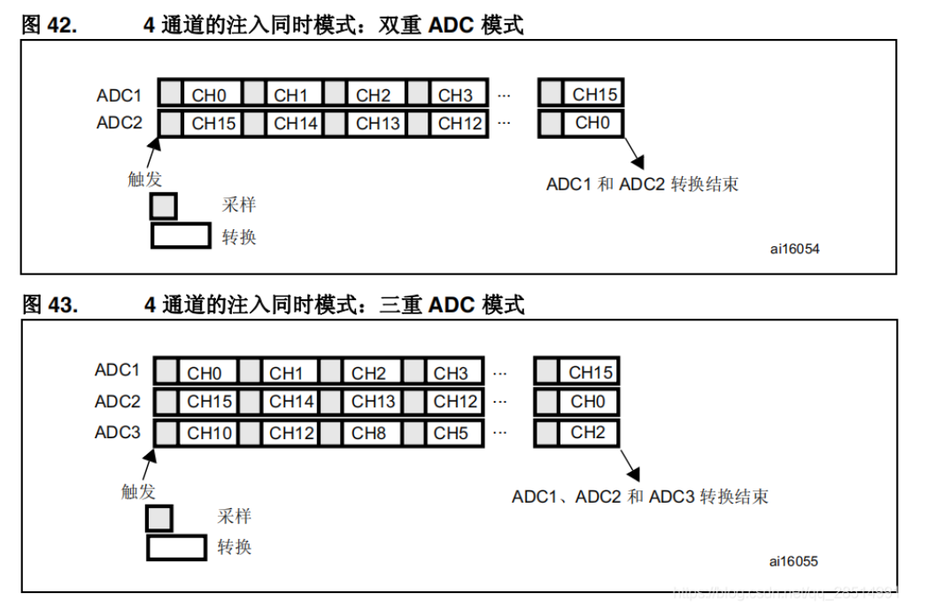 在具有两个或更多 ADC 的器件中,可使用双重(具有两个 ADC)和三重(具有三个 ADC)ADC 模式。在多重 ADC 模式下,通过 ADC1 主器件到 ADC2 和 ADC3 从器件的交替触发或同时触发来启动转换,具体取决于 ADC_CCR 寄存器中的 MULTI[4:0] 位所选的模式。