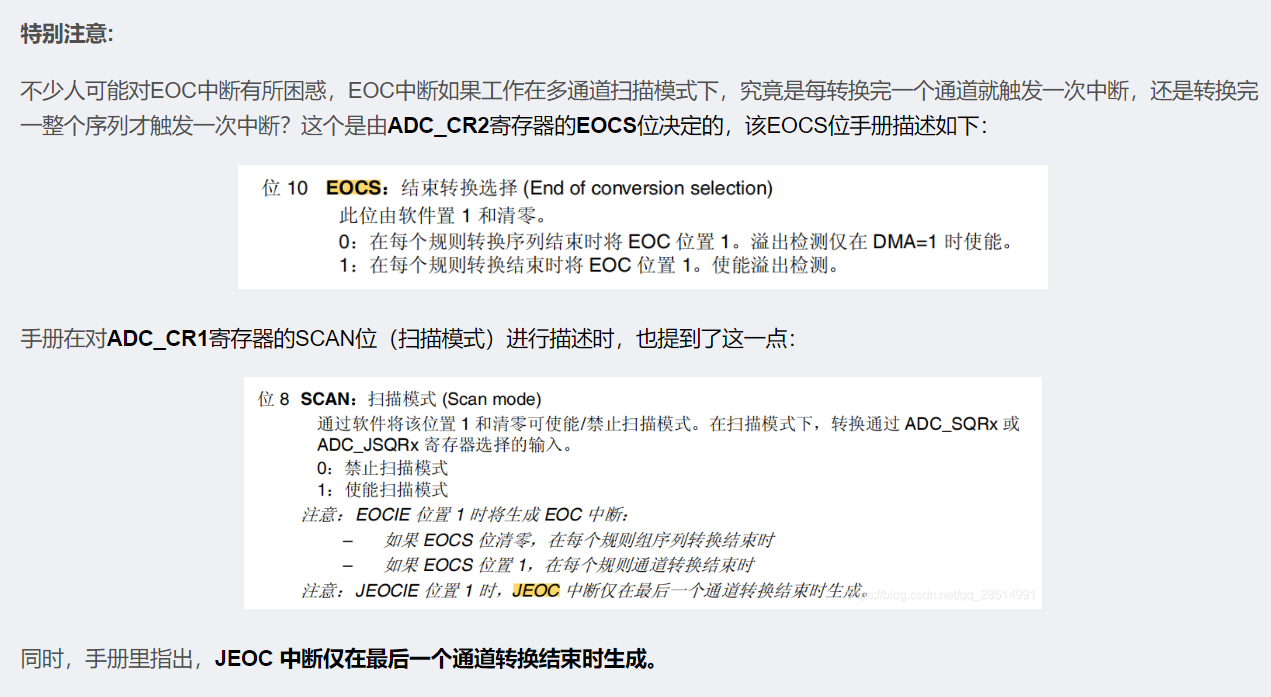 如果需要对多个ADC通道进行分组转换,组与组之间希望有可调的时间间隔。采样间断模式可能会比较方便。这块手册上也写的比较详细其且没有歧义。这里就不再过多描述。如果想详细了解,可以参阅手册或者点击这一篇博客。