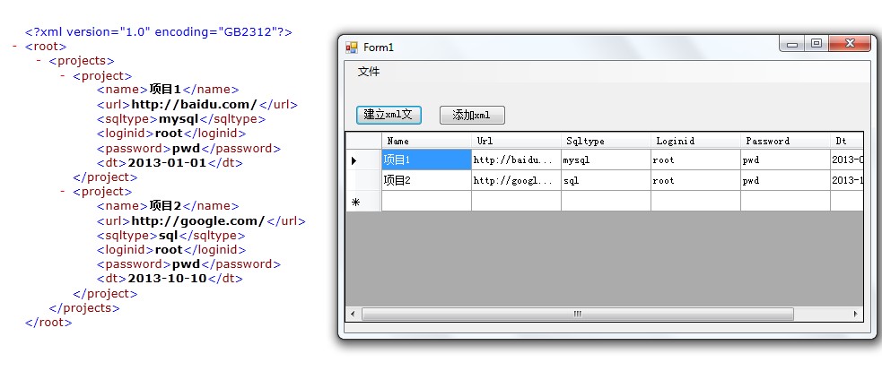 z.addnode("项目1", "http://baidu.com/", "mysql", "root", "pwd", "2013-01-01", @"d:\bb.xml");