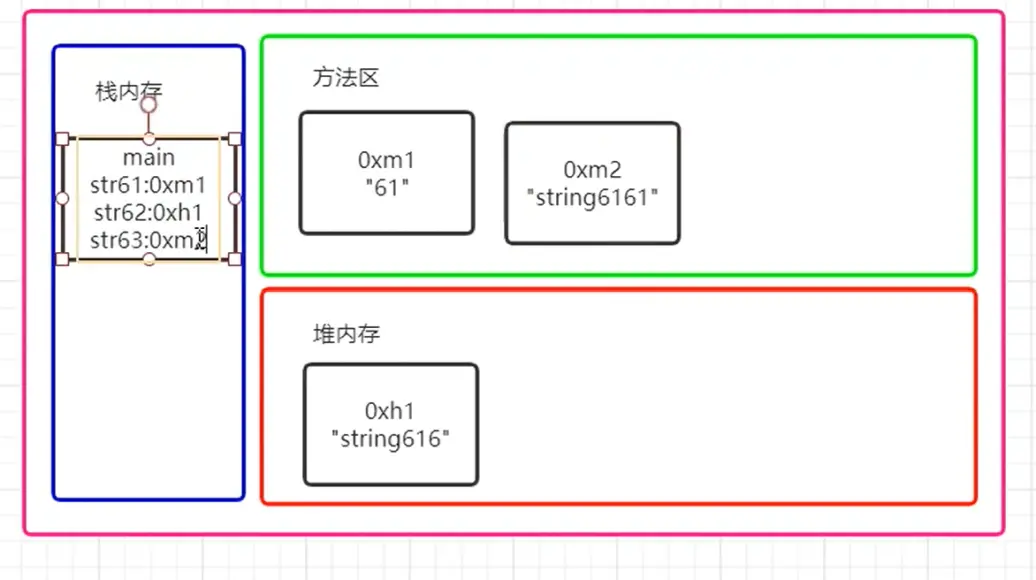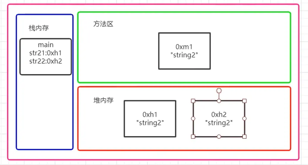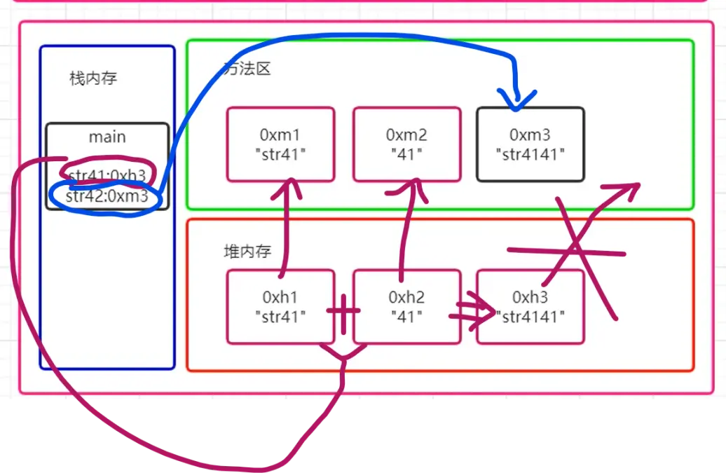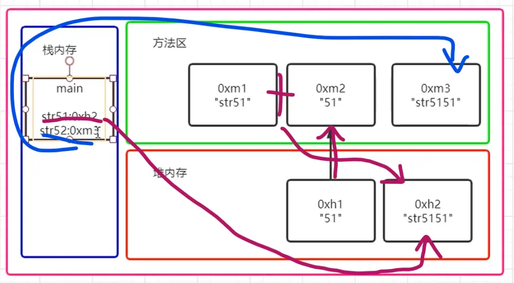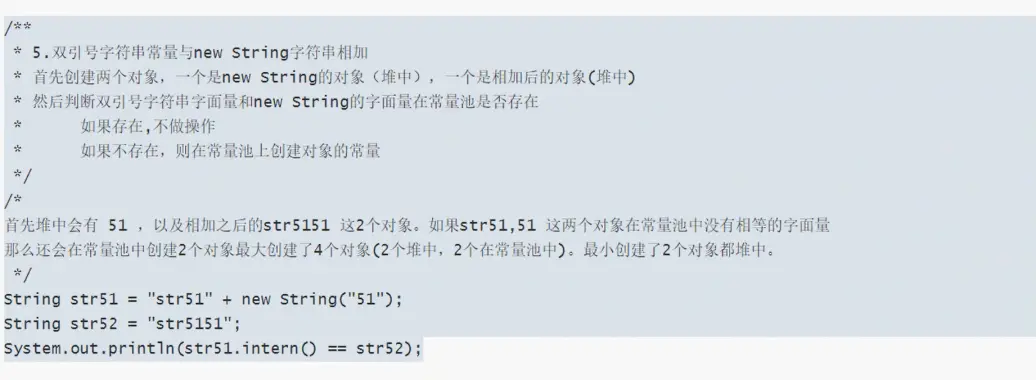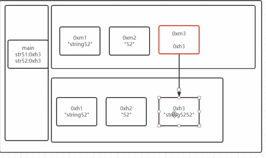 String str52="string5252";//不会新建字符串常量了,因为发现0xh3指向的即为所得 把常量带到堆内存中