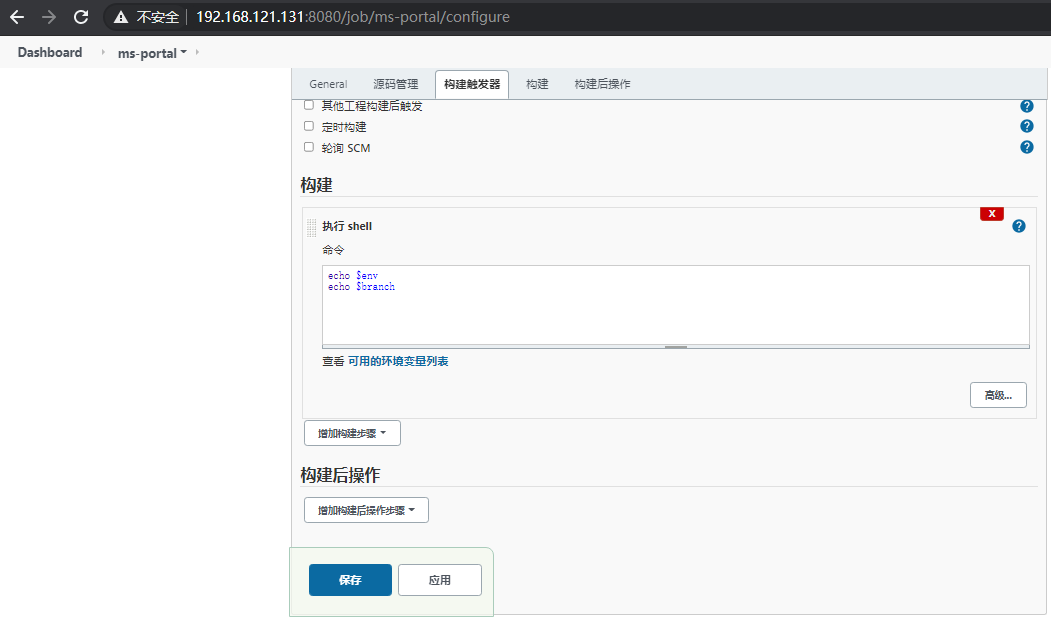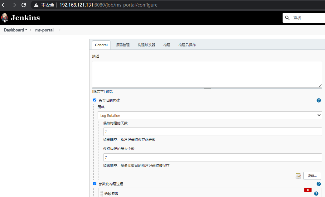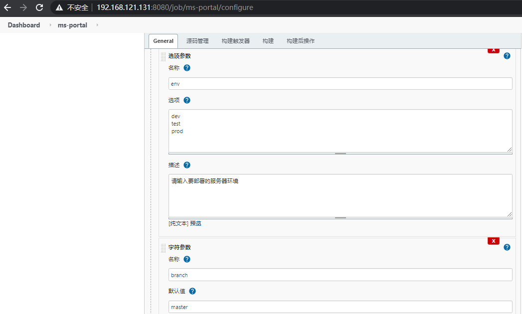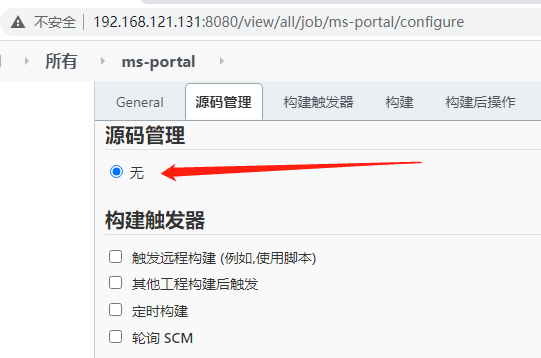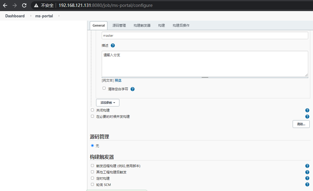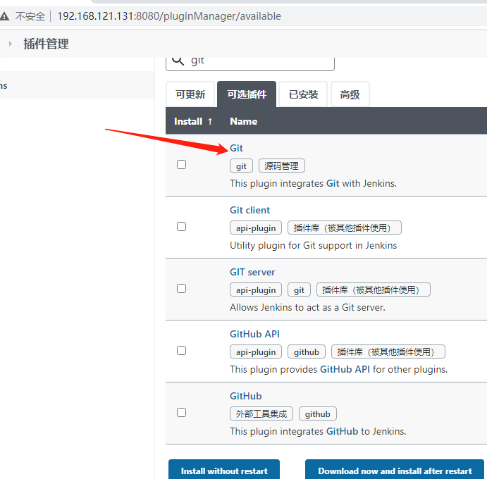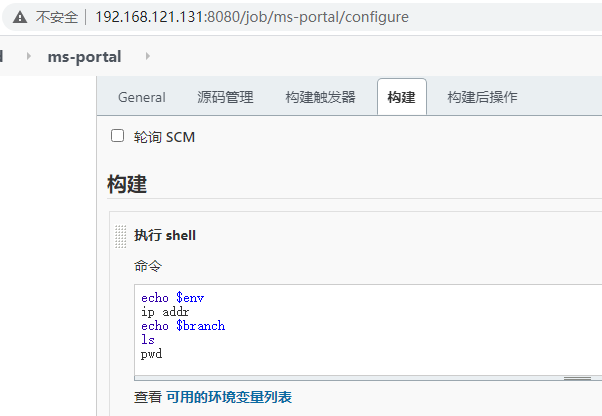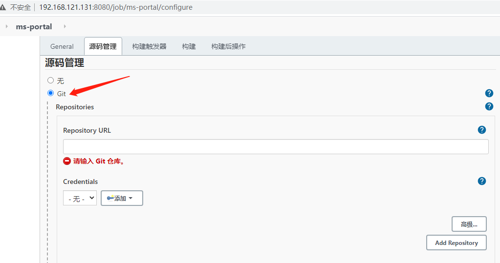安装git插件后,下图就会多出来一个git,填写git地址和用户密码,shell加上ip addr: