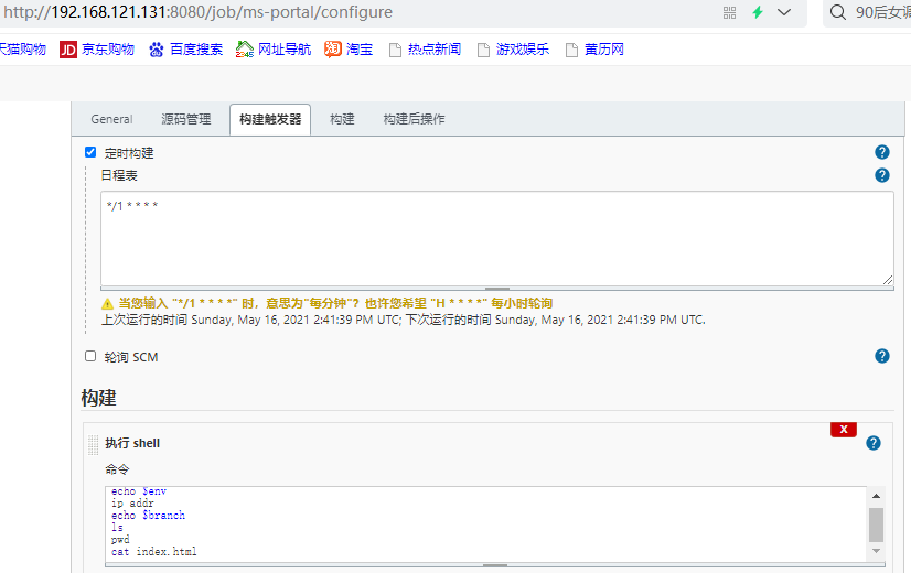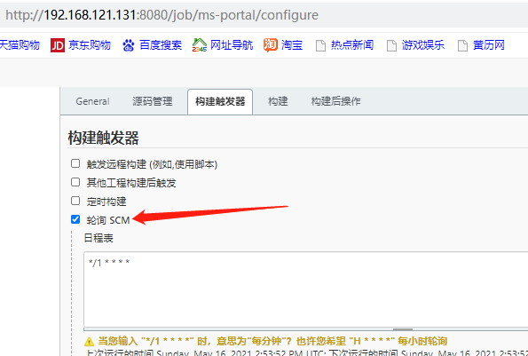 跟定时构建不同,轮询构建是自动按照定时设置去检查代码是否有更新,如果有更新就自动构建: