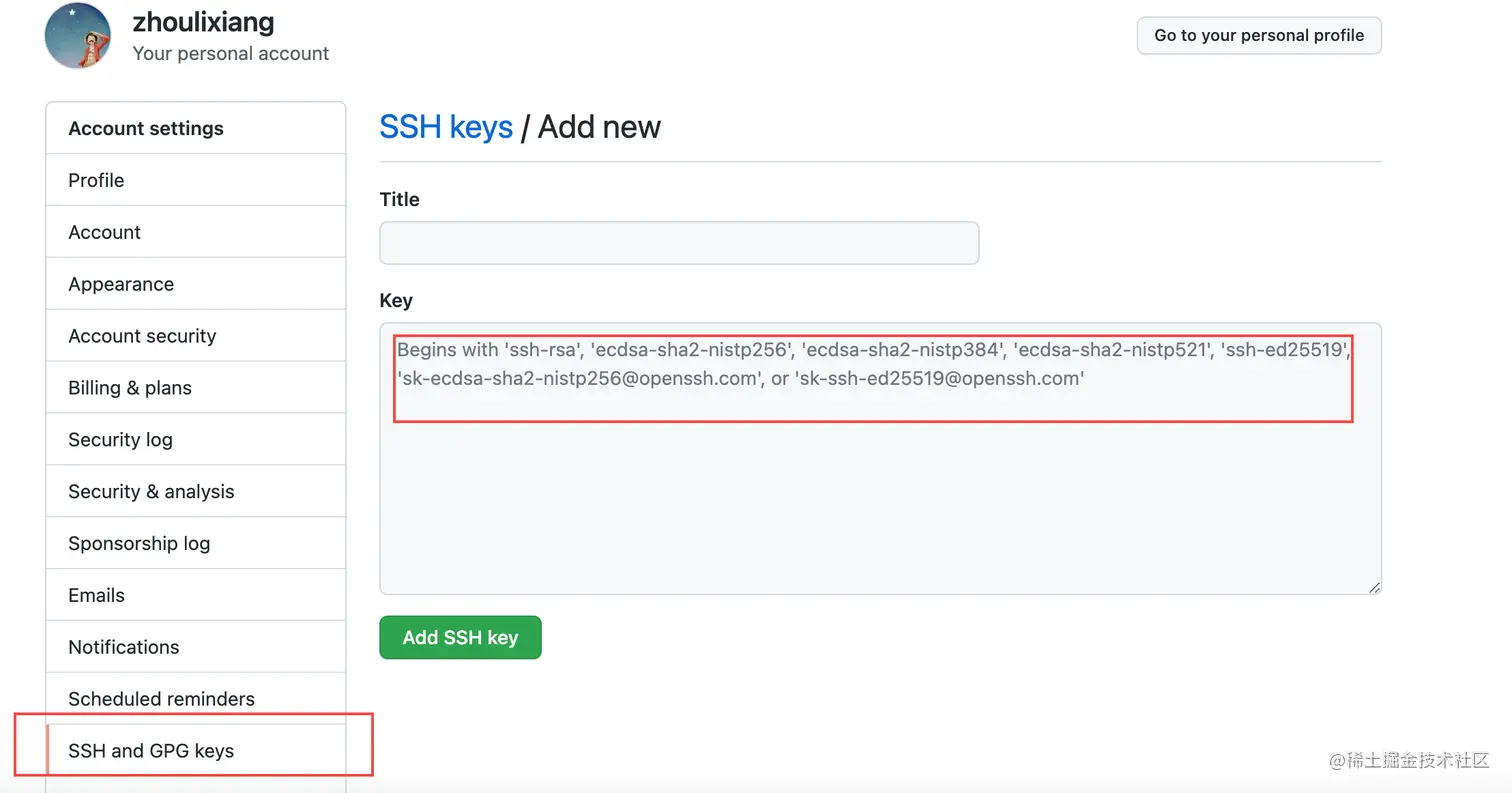 向远端仓库提交代码时,需要在远端仓库添加本地生成的 ssh key。