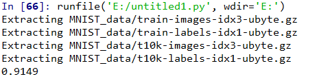 #机器学习入门是MNIST文字识别,学习编程的入门是打印‘HELLO WORLD’ from tensorflow.examples.tutorials.mnist import input_data mnist=input_data.read_data_sets('MNIST_data/',one_hot=True)#下载和安装MNIST数据集 #下载下来的数据集中被分成两部分:60000行训练数据集和10000行的测试数据集 import tensorflow as tf x=tf.placeholder('float',[None,784])#是一个占位符第一维度表示第几张图,第二维度表示每张图的像素 W=tf.Variable(tf.zeros([784,10])) b=tf.Variable(tf.zeros([10])) y=tf.nn.softmax(tf.matmul(x,W)+b)#实现模型 ##训练模型--建立模型 #首先先要定义一个指标来评估这个模型是好的。用‘交叉熵’ y_=tf.placeholder('float',[None,10])#在计算之前要添加新的占位符 cross_entropy=-tf.reduce_sum(y_*tf.log(y))#计算交叉熵,tf.reduce_sum是求和函数 train_step=tf.train.GradientDescentOptimizer(0.01).minimize(cross_entropy) #以上已经设置好了模型 init=tf.initialize_all_variables()#初始化创建的变量 sess=tf.Session() sess.run(init)#在session中启动模型 #之后开始训练模型,在此我们让模型循环1000次 for i in range(1000): batch_xs,batch_ys = mnist.train.next_batch(100) sess.run(train_step,feed_dict={x:batch_xs,y_:batch_ys}) #该循环的每个步骤中,会随机抓取训练数据中的100个批处理数据点。然后我们用这些数据点作为 #参数替换之前的占位符来运行train_step。 ##评估模型 correct_prediction=tf.equal(tf.argmax(y,1),tf.argmax(y_,1))#tf.argmax给出向量中的最大值 #而都是0,1所以可以验证predict和原值是否匹配 accuracy=tf.reduce_mean(tf.cast(correct_prediction,'float')) print(sess.run(accuracy,feed_dict={x:mnist.test.images,y_:mnist.test.labels}))