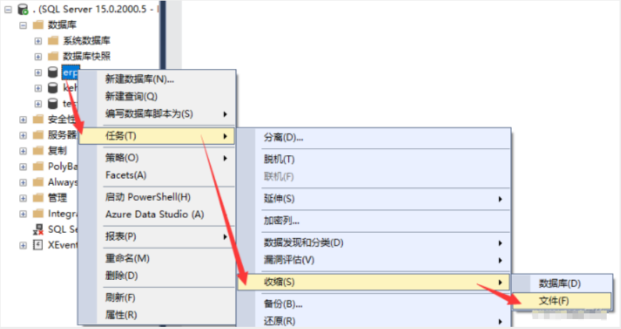 2、在数据库上点击右键 → 任务 → 收缩 → 文件