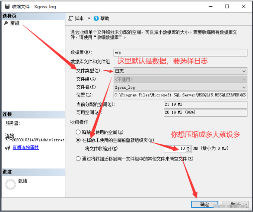 3、选择文件类型为日志,选择收缩操作为在释放未使用的空间前重新组织页,在其下面将文件收缩到后面的大小设置为固定的大小。如:1000MB