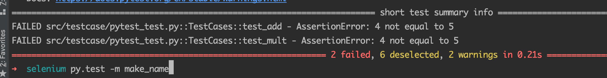 1 @pytest.mark.make_name 2 def test_add(self): 3 x = 4 4 y = 5 5 if x+ y != 10: 6 raise AssertionError(f'{x} not equal to {y}') 7 8 @pytest.mark.make_name 9 def test_mult(self): 10 x = 4 11 y = 5 12 if x * y != 10: 13 raise AssertionError(f'{x} not equal to {y}')