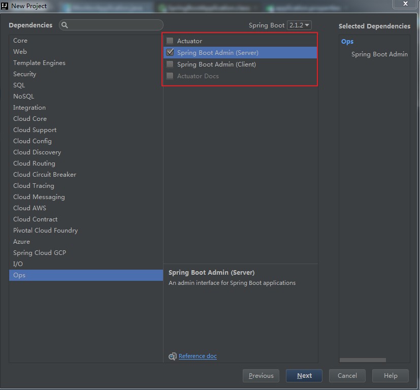 - 按文档说明,最好创建一个新的Project用于监测。创建到选择Dependencies的时候,发现Ops下可以选Spring Boot Admin(Server)