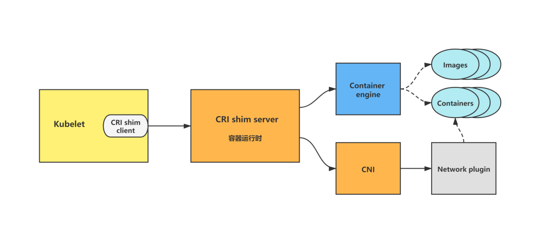 实现了 CRI 接口的容器运行时通常称为 CRI shim, 这是一个 gRPC Server,监听在本地的 unix socket 上;而 kubelet 作为 gRPC 的客户端来调用 CRI 接口,来进行 Pod 和容器、镜像的生命周期管理。另外,容器运行时需要自己负责管理容器的网络,推荐使用 CNI。