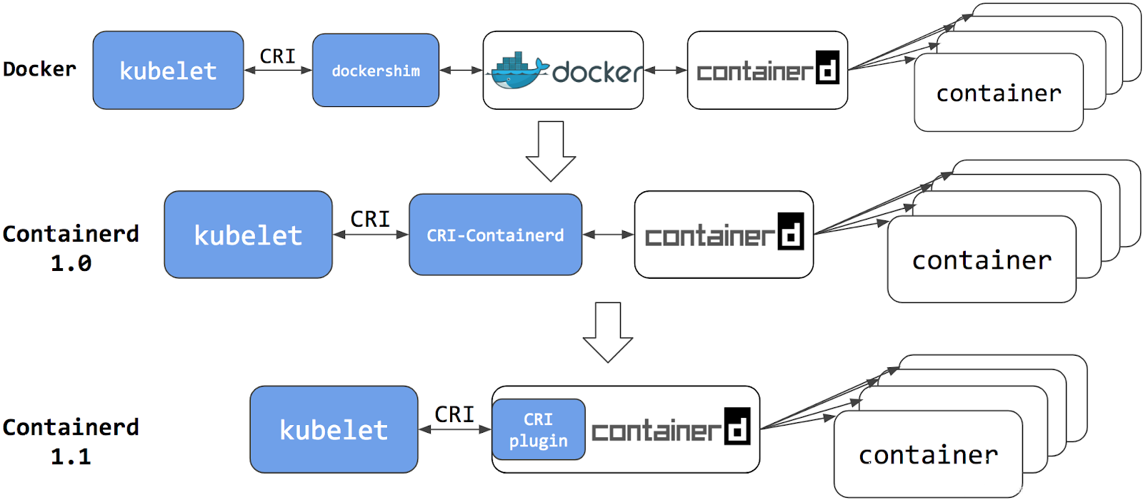 2017年docker捐献containerd,支持CNI. 2018年k8s集成containerdK8s支持Containerd 的流程变化如下:
